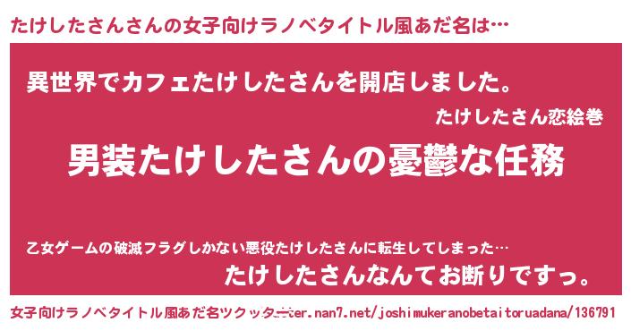 | 男性向けラノベタイトル風あだ名 | 『冴えないたけしたさんの育てかた』 |