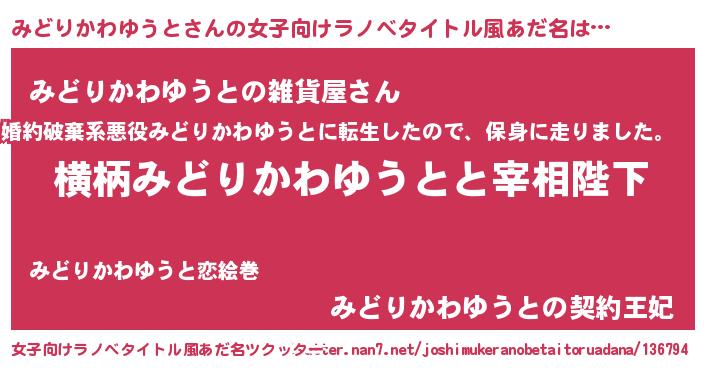 | 男性向けラノベタイトル風あだ名 | 『みどりかわゆうとに滅ぼされるだけの簡単なお仕事です』 |