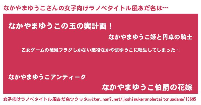 | 男性向けラノベタイトル風あだ名 | 『魔弾の王となかやまゆうこ』 |