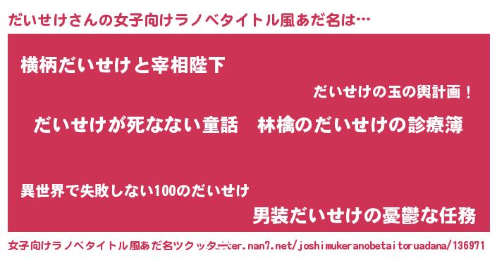 | 男性向けラノベタイトル風あだ名 | 『魔弾の王とだいせけ』 |