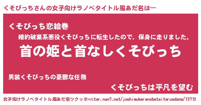 | 男性向けラノベタイトル風あだ名 | 『はたらくくそびっちさま!』 |