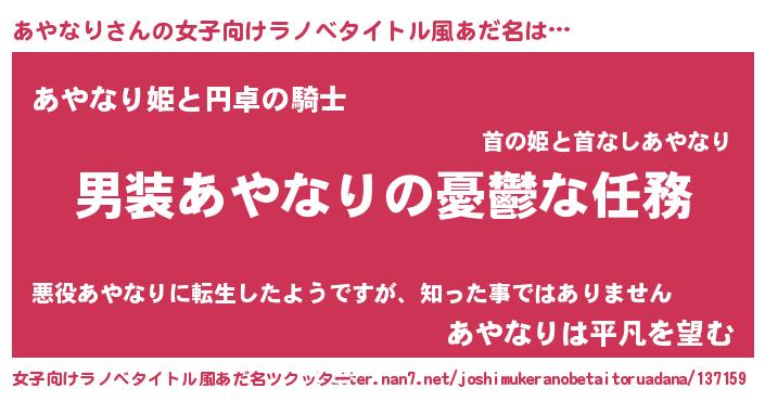 | 男性向けラノベタイトル風あだ名 | 『うちのあやなりが世界を掌握している!』 |
