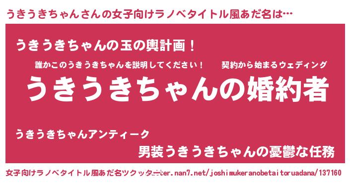 | 男性向けラノベタイトル風あだ名 | 『うちの娘の為ならば、俺はもしかしたらうきうきちゃんも倒せるかもしれない。』 |