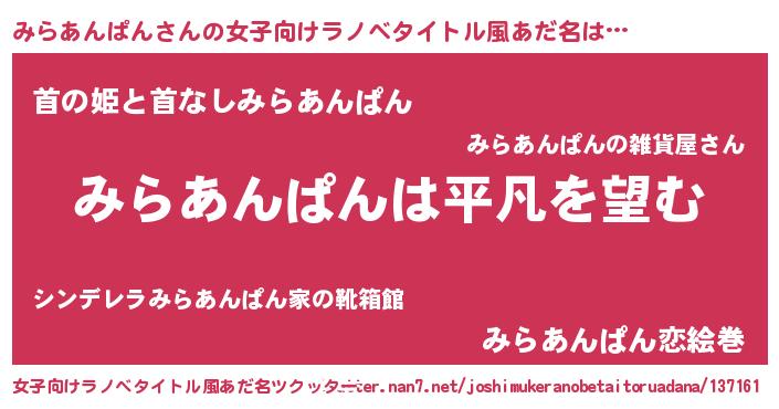 | 男性向けラノベタイトル風あだ名 | 『ダンジョンにみらあんぱんを求めるのは間違っているだろうか』 |