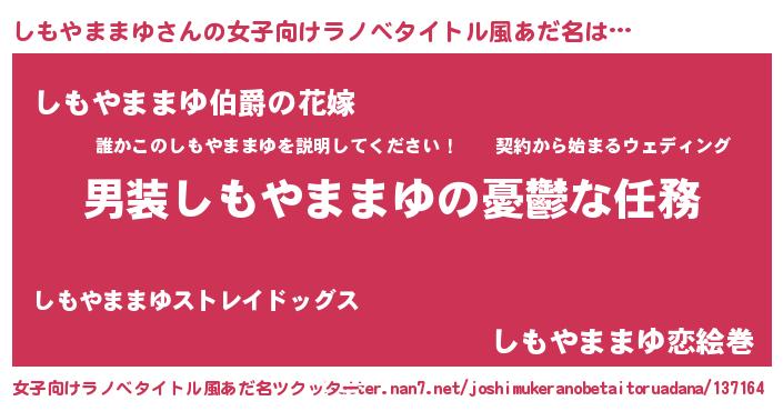 | 男性向けラノベタイトル風あだ名 | 『うちのしもやままゆが世界を掌握している!』 |