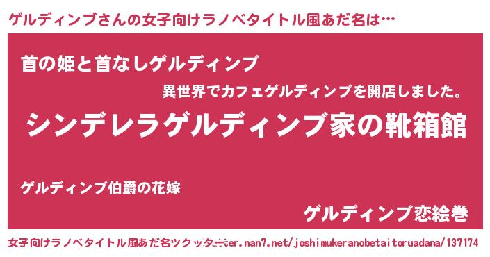 | 男性向けラノベタイトル風あだ名 | 『冴えないゲルディンブの育てかた』 |