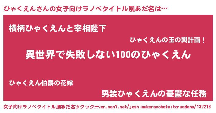ひゃくえんさんの女子向けラノベタイトル風あだ名は… 『異世界で失敗しない100のひゃくえん』『横柄ひゃくえんと宰相陛下』『男装ひゃくえんの憂鬱な任務』 ツクッター #女子向けラノベタイトル風あだ名ツクッター http://tkutter.nan7.net/joshimukeranobetaitoruadana/137218/