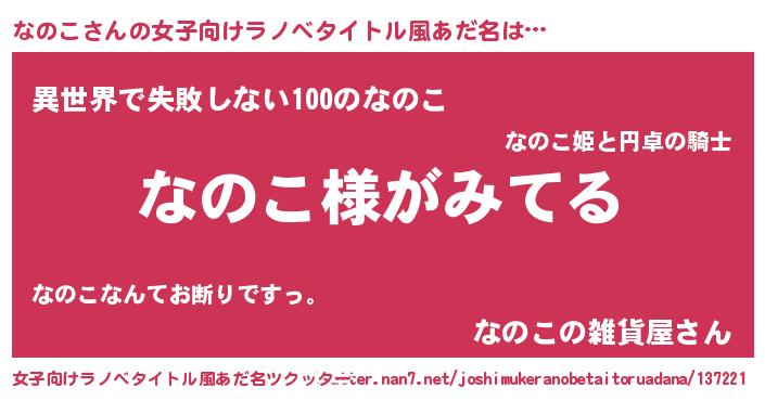 なのこさんの女子向けラノベタイトル風あだ名は… 『なのこ様がみてる』『異世界で失敗しない100のなのこ』『なのこの雑貨屋さん』 ツクッター #女子向けラノベタイトル風あだ名ツクッター http://tkutter.nan7.net/joshimukeranobetaitoruadana/137221/