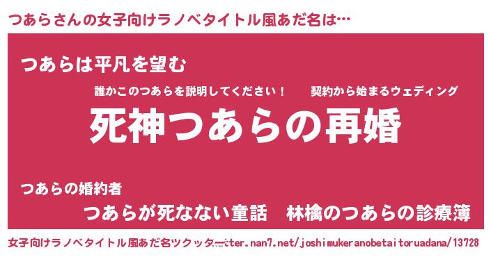 | 男性向けラノベタイトル風あだ名 | 『ノーゲーム・ノーツアラ』 |