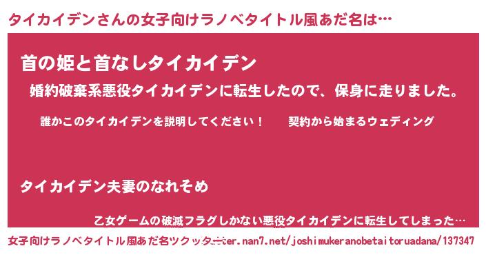 | 男性向けラノベタイトル風あだ名 | 『タイカイデンアートオンライン』 |