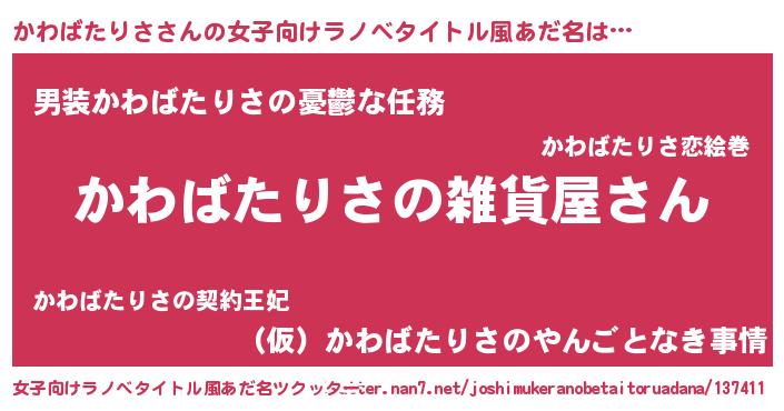 | 男性向けラノベタイトル風あだ名 | 『やはりかわばたりさの青春ラブコメはまちがっている 』 |