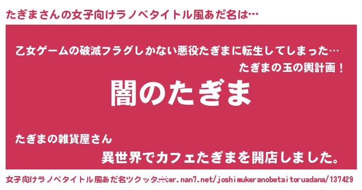 | 男性向けラノベタイトル風あだ名 | 『Re:たぎまから始める異世界生活』 |