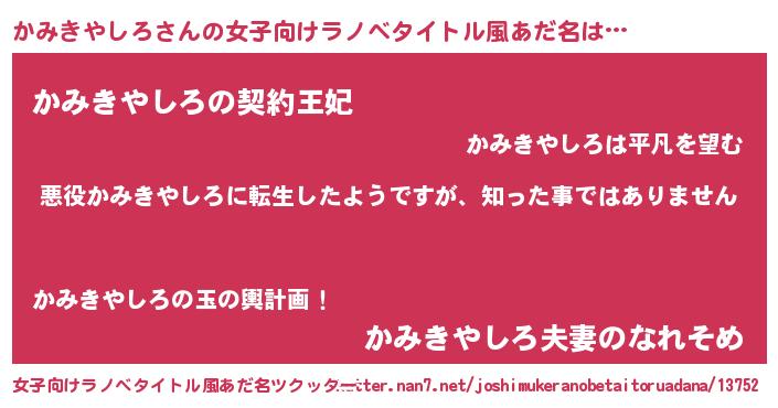 | 男性向けラノベタイトル風あだ名 | 『この素晴らしい世界にかみきやしろを!』 |