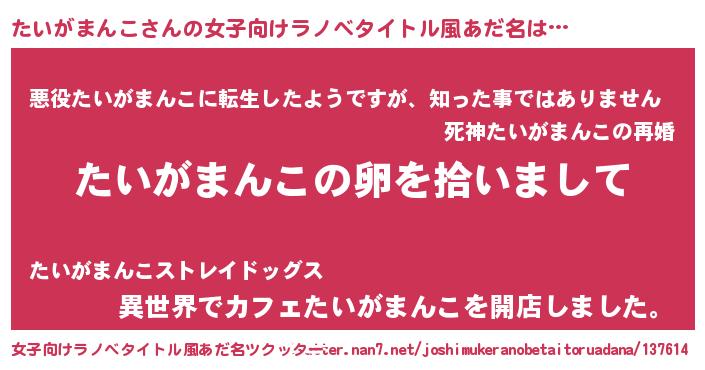 | 男性向けラノベタイトル風あだ名 | 『たいがまんこの嫁は女の子じゃないと思った?』 |