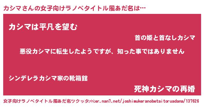 | 男性向けラノベタイトル風あだ名 | 『この素晴らしい世界にカシマを!』 |