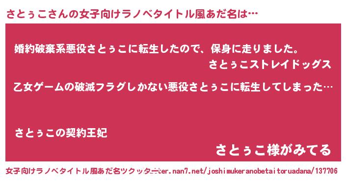 | 男性向けラノベタイトル風あだ名 | 『この素晴らしい世界にさとぅこを!』 |