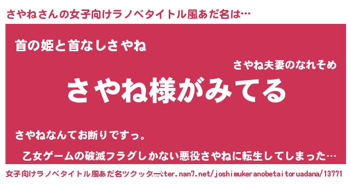 | 男性向けラノベタイトル風あだ名 | 『さやねの嫁は女の子じゃないと思った?』 |