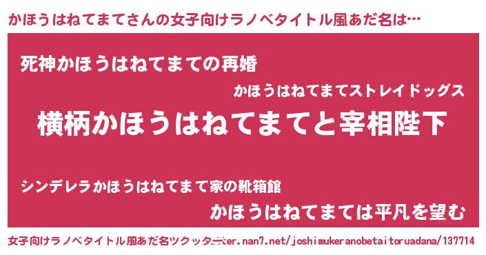 | 男性向けラノベタイトル風あだ名 | 『かほうはねてまてに滅ぼされるだけの簡単なお仕事です』 |