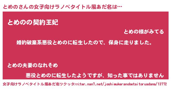 とめのさんの女子向けラノベタイトル風あだ名は… 『婚約破棄系悪役とめのに転生したので、保身に走りました。』『とめのの契約王妃』『悪役とめのに転生したようですが、知った事ではありません』 ツクッター #女子向けラノベタイトル風あだ名ツクッター http://tkutter.nan7.net/joshimukeranobetaitoruadana/13772/