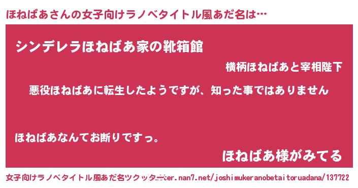 | 男性向けラノベタイトル風あだ名 | 『この素晴らしい世界にほねばあを!』 |