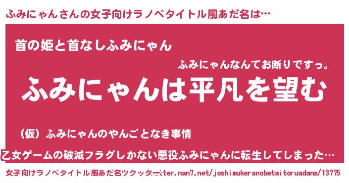 | 胡散臭い通販商品みたいなあだ名 | 『信頼と実績のサプリメント…その名も「ふみにゃん」』 |