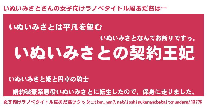 | 胡散臭い通販商品みたいなあだ名 | 『来世でも幸せになれる健康食品…その名も「いぬいみさと」』 |