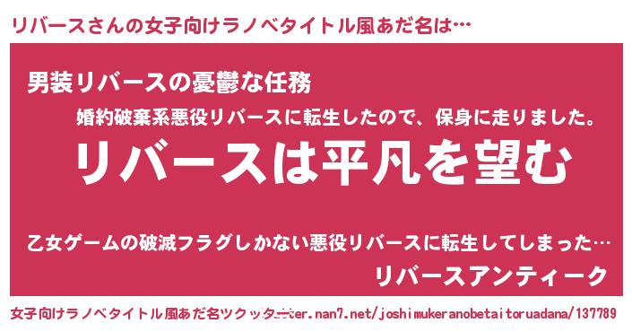 リバースさんの女子向けラノベタイトル風あだ名は… 『リバースは平凡を望む』『男装リバースの憂鬱な任務』『リバースアンティーク』 ツクッター #女子向けラノベタイトル風あだ名ツクッター http://tkutter.nan7.net/joshimukeranobetaitoruadana/137789/