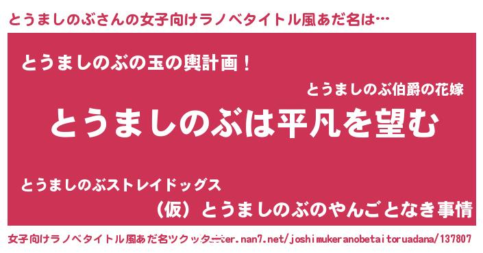 とうましのぶさんの女子向けラノベタイトル風あだ名は… 『とうましのぶは平凡を望む』『とうましのぶの玉の輿計画!』『(仮)とうましのぶのやんごとなき事情』 ツクッター #女子向けラノベタイトル風あだ名ツクッター http://tkutter.nan7.net/joshimukeranobetaitoruadana/137807/