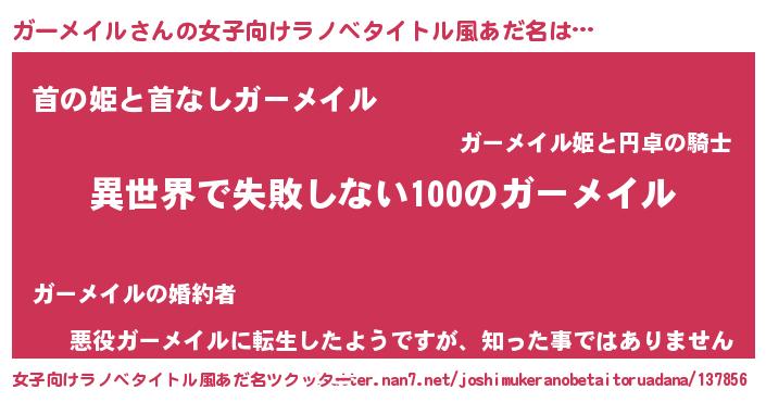 | 男性向けラノベタイトル風あだ名 | 『ガーメイルという概念が存在しない退屈な世界 』 |