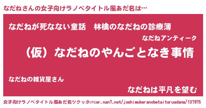| 男性向けラノベタイトル風あだ名 | 『なだねの憂鬱』『魔弾の王となだね』 |