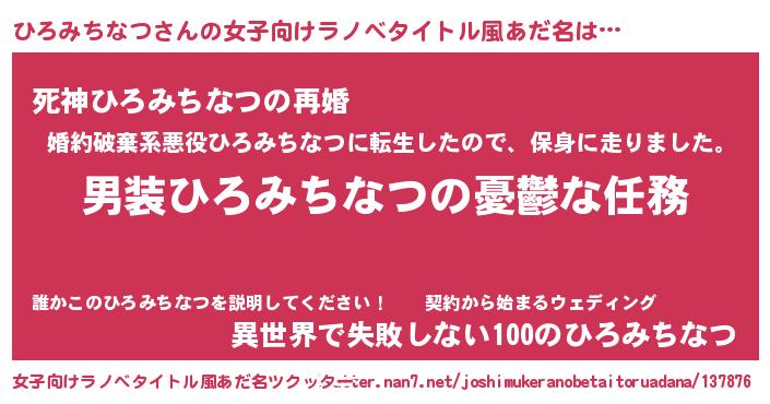 | 男性向けラノベタイトル風あだ名 | 『うちのひろみちなつが世界を掌握している!』 |