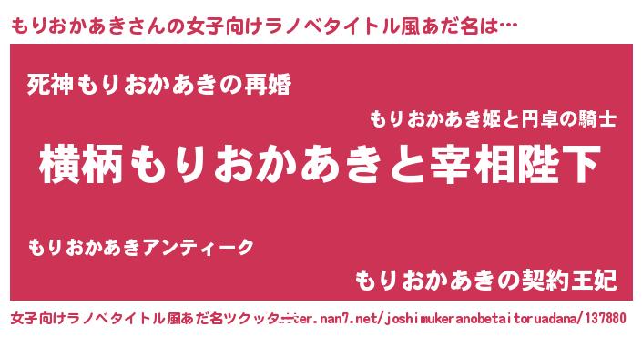 | 男性向けラノベタイトル風あだ名 | 『もりおかあきに滅ぼされるだけの簡単なお仕事です』 |