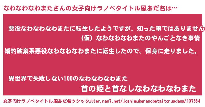 | 男性向けラノベタイトル風あだ名 | 『ナワナワナワマタスレイヤー』 |