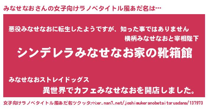 | 胡散臭い通販商品みたいなあだ名 | 『ハリウッド女優が絶賛した世界で10本だけ現存している希少なブランデー…その名も「みなせなお」』 |
