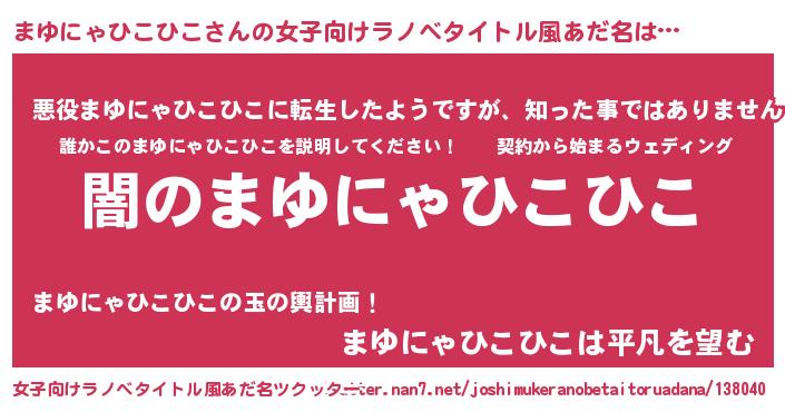 | 男性向けラノベタイトル風あだ名 | 『Re:まゆにゃひこひこから始める異世界生活』 |