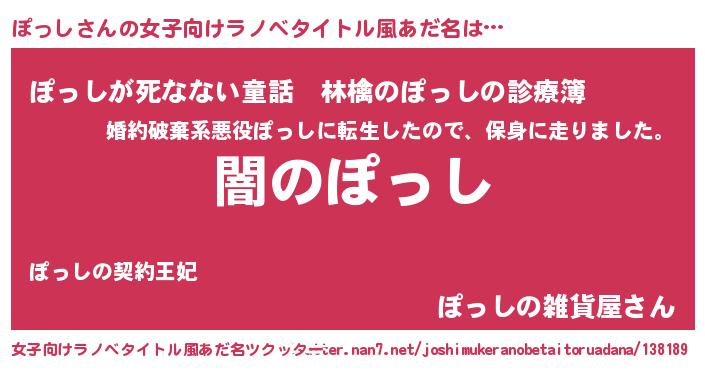 | 男性向けラノベタイトル風あだ名 | 『Re:ぽっしから始める異世界生活』 |