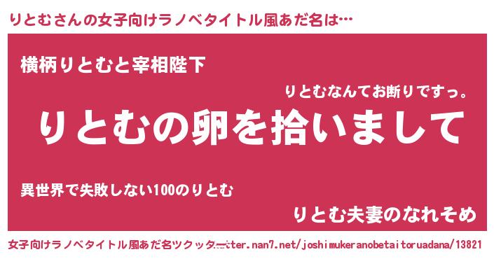 | 男性向けラノベタイトル風あだ名 | 『りとむの嫁は女の子じゃないと思った?』 |