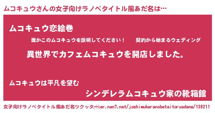 | 男性向けラノベタイトル風あだ名 | 『誰もが恐れるあのムコキュウが、ぼくの専属メイドになるようです。』 |