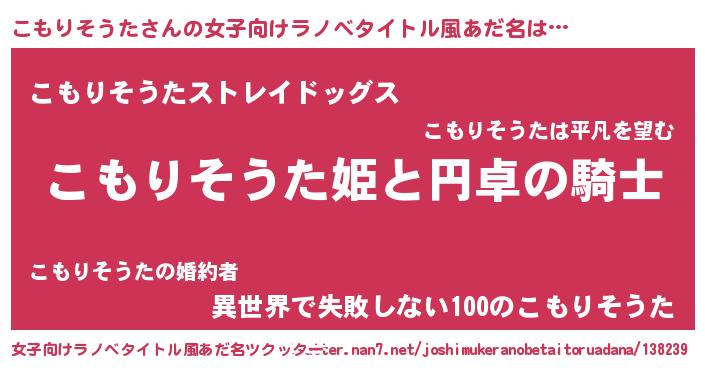 | 男性向けラノベタイトル風あだ名 | 『コモリソウタアートオンライン』 |