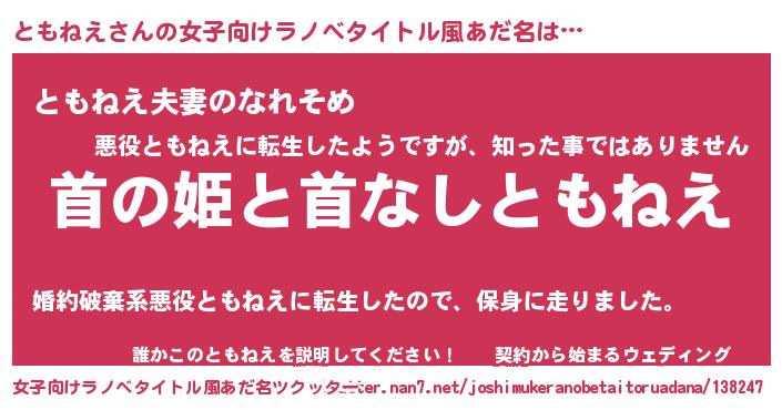 ともねえさんの女子向けラノベタイトル風あだ名は… 『首の姫と首なしともねえ』『ともねえ夫妻のなれそめ』『誰かこのともねえを説明してください! ~契約から始まるウェディング~』 ツクッター #女子向けラノベタイトル風あだ名ツクッター http://tkutter.nan7.net/joshimukeranobetaitoruadana/138247/