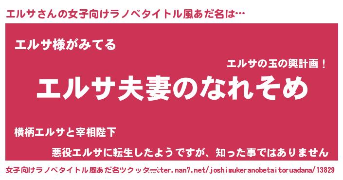 | 男性向けラノベタイトル風あだ名 | 『おまえをオタクにしてやるから、俺をエルサにしてくれ! 』 |