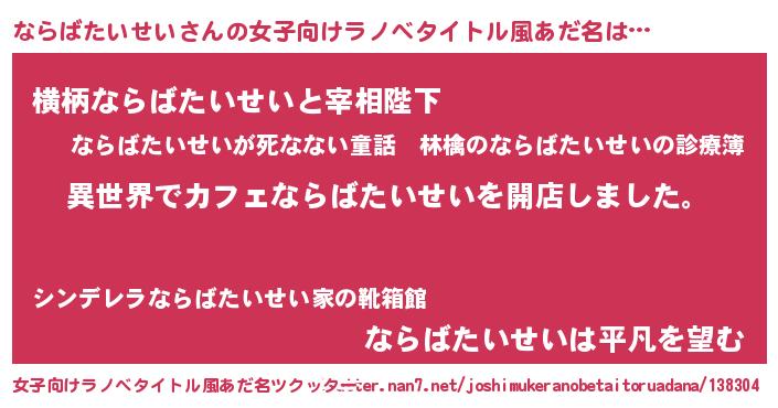 ならばたいせいさんの女子向けラノベタイトル風あだ名は… 『異世界でカフェならばたいせいを開店しました。』『横柄ならばたいせいと宰相陛下』『ならばたいせいは平凡を望む』 ツクッター #女子向けラノベタイトル風あだ名ツクッター http://tkutter.nan7.net/joshimukeranobetaitoruadana/138304/