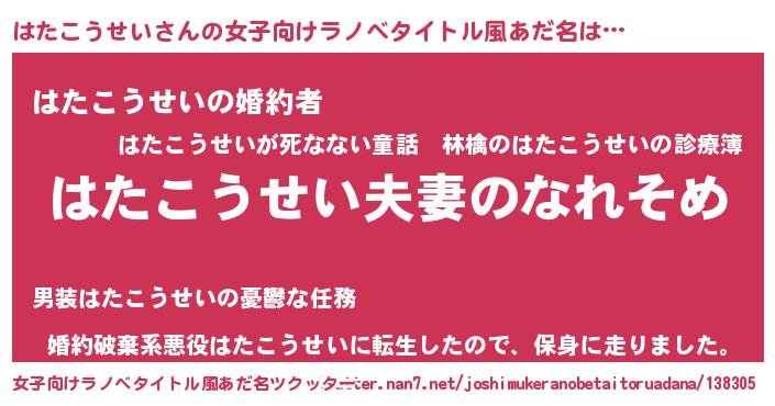 | 男性向けラノベタイトル風あだ名 | 『おまえをオタクにしてやるから、俺をはたこうせいにしてくれ! 』 |