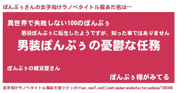 ぽんぷぅさんの女子向けラノベタイトル風あだ名は… 『男装ぽんぷぅの憂鬱な任務』『異世界で失敗しない100のぽんぷぅ』『ぽんぷぅ様がみてる』 ツクッター #女子向けラノベタイトル風あだ名ツクッター http://tkutter.nan7.net/joshimukeranobetaitoruadana/138346/