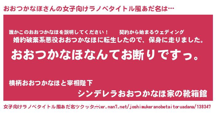 おおつかなほさんの女子向けラノベタイトル風あだ名は… 『おおつかなほなんてお断りですっ。』『誰かこのおおつかなほを説明してください! ~契約から始まるウェディング~』『シンデレラおおつかなほ家の靴箱館』 ツクッター #女子向けラノベタイトル風あだ名ツクッター http://tkutter.nan7.net/joshimukeranobetaitoruadana/138347/