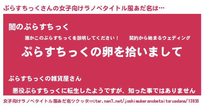 | 男性向けラノベタイトル風あだ名 | 『ぷらすちっくの嫁は女の子じゃないと思った?』 |