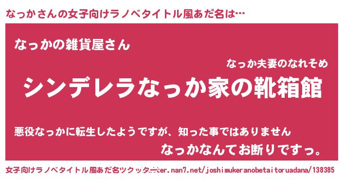 | 男性向けラノベタイトル風あだ名 | 『冴えないなっかの育てかた』 |