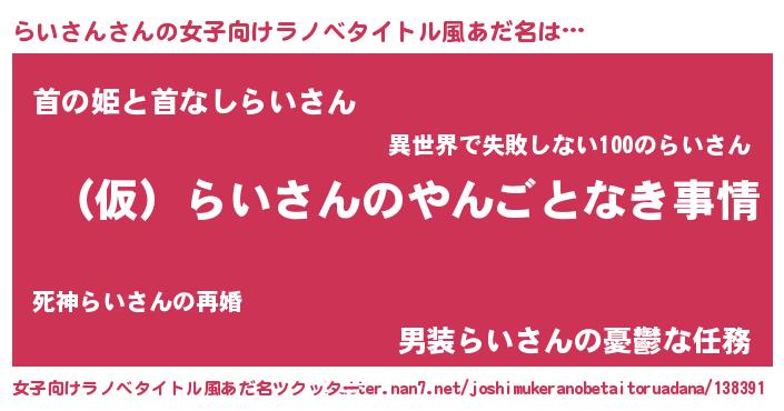 らいさんさんの女子向けラノベタイトル風あだ名は… 『(仮)らいさんのやんごとなき事情』『首の姫と首なしらいさん』『男装らいさんの憂鬱な任務』 ツクッター #女子向けラノベタイトル風あだ名ツクッター http://tkutter.nan7.net/joshimukeranobetaitoruadana/138391/