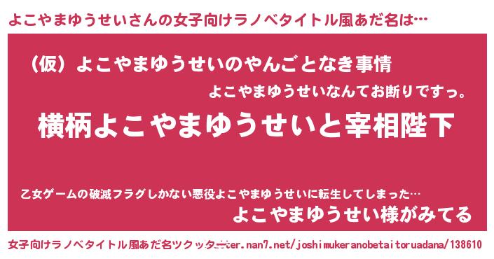 | 男性向けラノベタイトル風あだ名 | 『よこやまゆうせいに滅ぼされるだけの簡単なお仕事です』 |