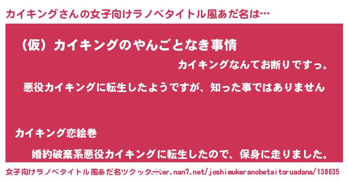 | 男性向けラノベタイトル風あだ名 | 『この素晴らしい世界にカイキングを!』 |